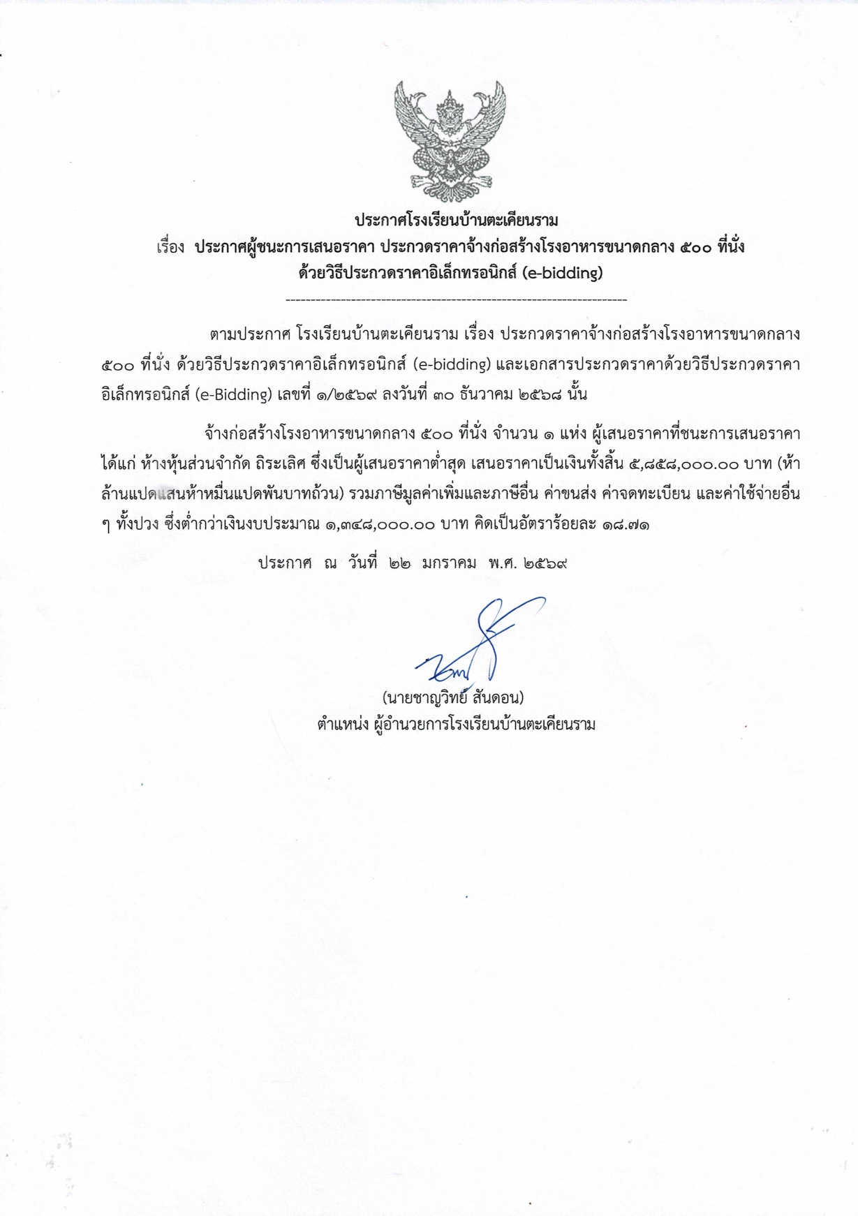 >>ประกาศโรงเรียนบ้านตะเคียนราม เรื่อง ประกาศผู้ชนะการเสนอราคา ประกวดราคาจ้างก่อสร้างโรงอาหารขนาดกลาง 500 ที่นั่ง ด้วยวิธีประกวดราคาอิเล็กทรอนิกส์(e-bidding) ลงวันที่ ๒๒ มกราคม 2569