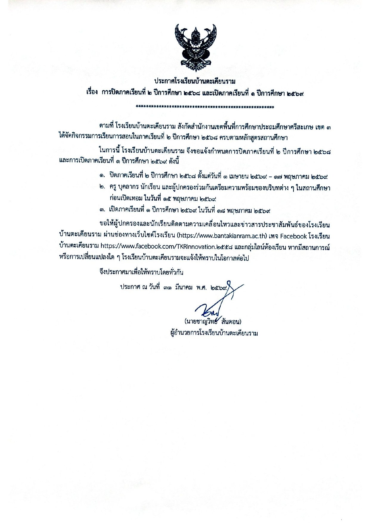 ประกาศปิดเรียนภาคเรียนที่ 2/2568 และเปิดเรียนภาคเรียนที่ 1/2569